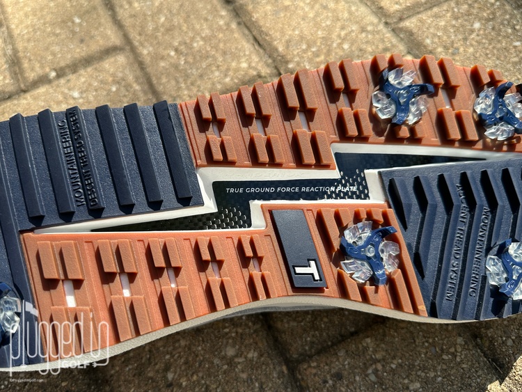 Turning back to the sole, everyone will pay attention to the spikes, but that’s not the only story. The Lux² Maven also has a full-length carbon fiber plate. We’ve seen this in some offerings from FootJoy and PAYNTR, and it’s common in high end running shoes. The purpose is to improve energy return during the swing. I found that the sole moved with me while walking, but it definitely provided a more rigid feel underfoot.