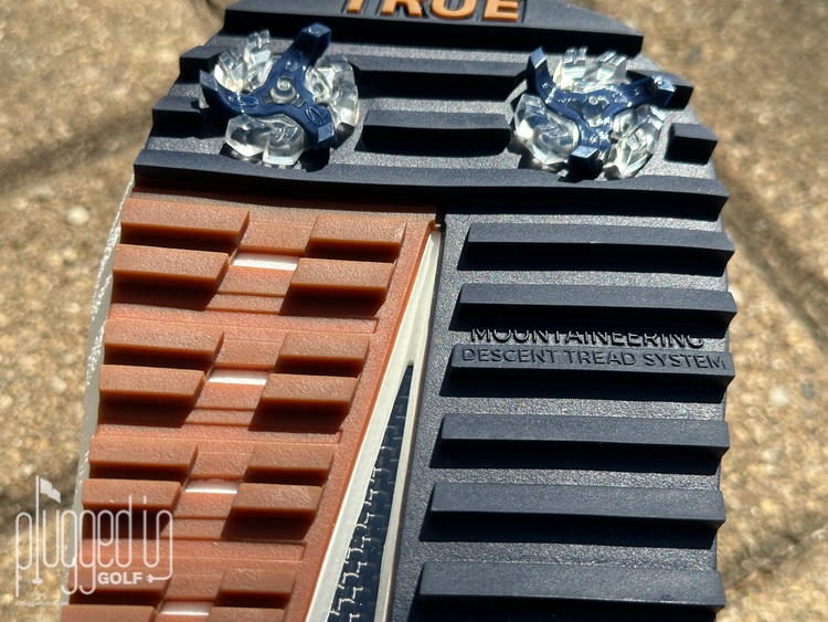 The TRUE Linkswear Lux² Maven is the first TRUE to feature removable spikes, so we’re going to start with the traction. It’s extremely impressive. This comes from the combination of the spikes and what TRUE calls the “Mountaineering Descent Tread System”. In every condition – mats, grass, wet, dry, flat, sloped – these shoes created some of the best traction I’ve ever experienced. I had full confidence swinging all-out because I knew my feet were rooted to the ground.