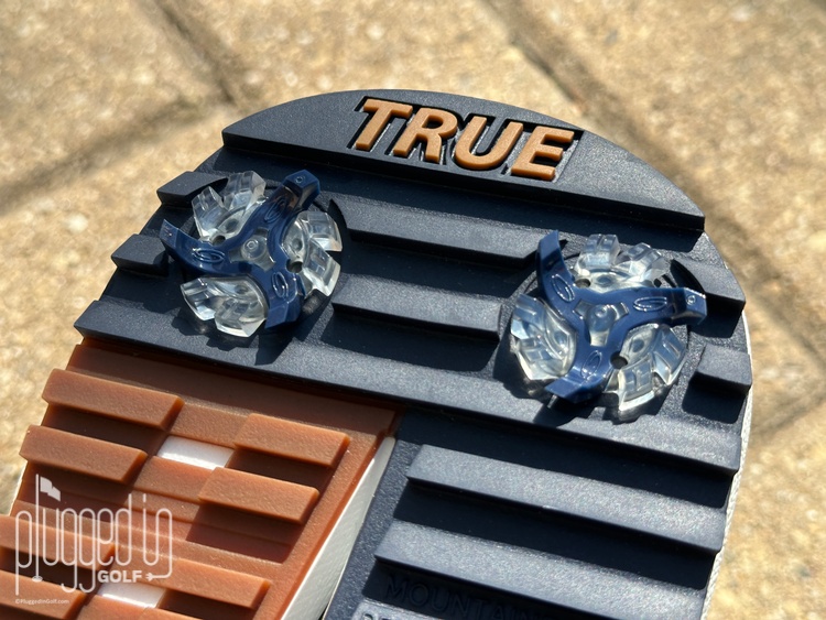The TRUE Linkswear Lux² Maven is the first TRUE to feature removable spikes, so we’re going to start with the traction.  It’s extremely impressive.  This comes from the combination of the spikes and what TRUE calls the “Mountaineering Descent Tread System”.  In every condition – mats, grass, wet, dry, flat, sloped – these shoes created some of the best traction I’ve ever experienced.  I had full confidence swinging all-out because I knew my feet were rooted to the ground.