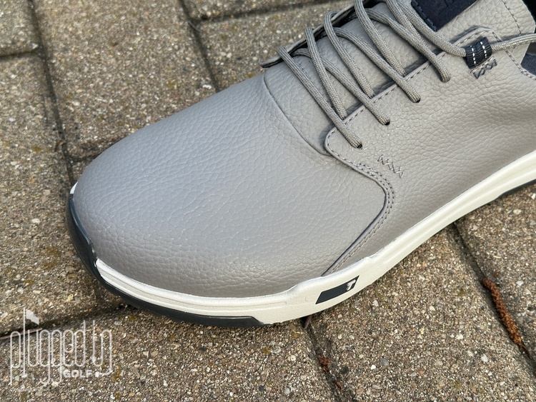 The majority of the TRUE Linkswear OG3 Pro is one solid color (except in the PNW colorway). The “next generation pebbled engineered leather” looks premium in every colorway. A contrast color – the amount of contrast varies – adds a little visual interest. TRUE kept the branding tasteful with two “TRUE” markings on the heel and one embossed on the tongue.