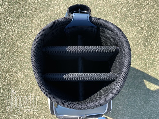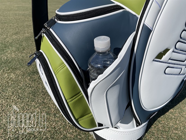 I found the 9.5” opening had plenty of room for 14 clubs, and the six sections kept my clubs easily accessible and organized.  The bag also comes with a color coordinated snap on rain hood that includes a long zipper.  If you’ve witnessed tour players and their caddies deal with rain, this is the hood you want for inclement weather.