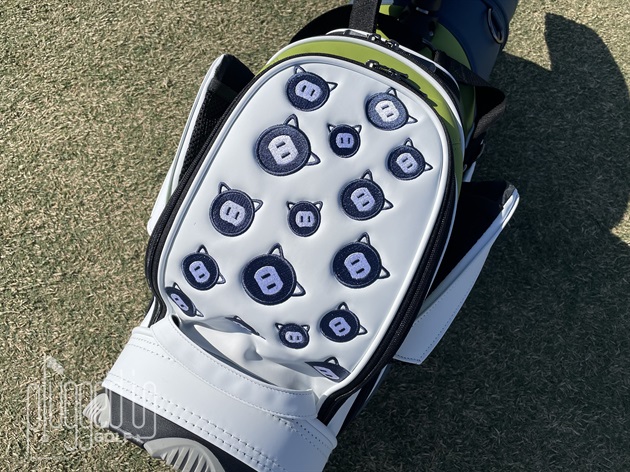 The bag is a model JS-OOM midsize staff bag with 9.5” opening.  Midsize is relative, but to me it’s like a cart bag on steroids.  The key to a custom bag like this UFO beauty is that it’s full of areas to embellish.  I love the big PIG icon peeking out on the front panel, and the dancing PIGs on the back side ball pocket.