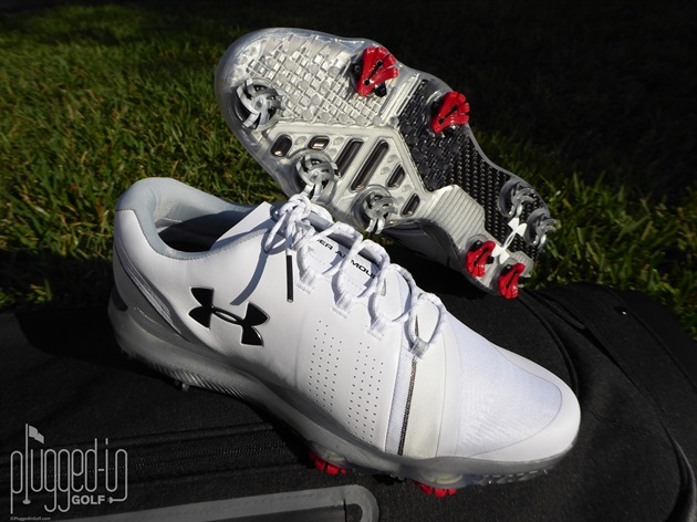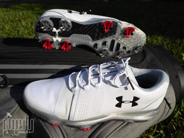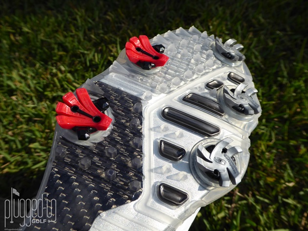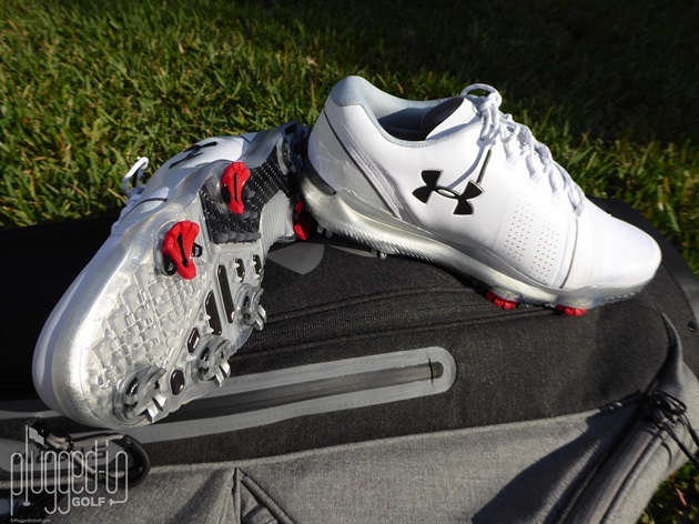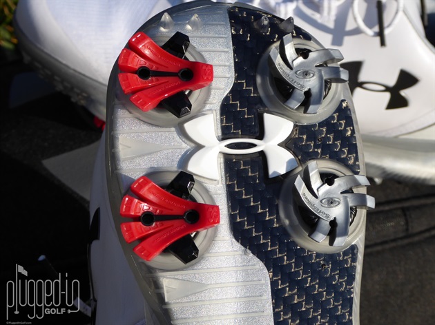 The distinctive red UA Rotational Resistance spikes have a lower profile as does the outsole, which made the shoes feel more grounded. Between the traditional Softspikes and the ample molded points and nubs, the traction is as good as it gets. The strategic locations of all the traction elements harness and then transfer power when appropriate in the golf swing.
