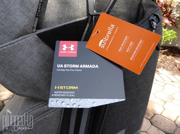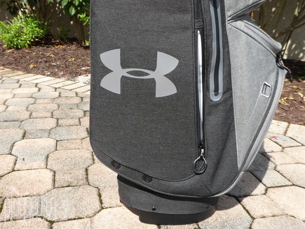 The UA Storm Armada Sunbrella Cart Bag comes in the one color shown – graphite heather. The combination of dark and light greys gives the bag a crisp, upscale persona. The UA logos aren’t small, but they blend in subtlety. As with the Sun Mountain branded bags, having a logo that doesn’t relate to club brands is a positive attribute. The feel of the Sunbrella fabric also adds the swagger of the bag – it’s heavier, in a sturdy way, than typical nylon with a pleasing texture.