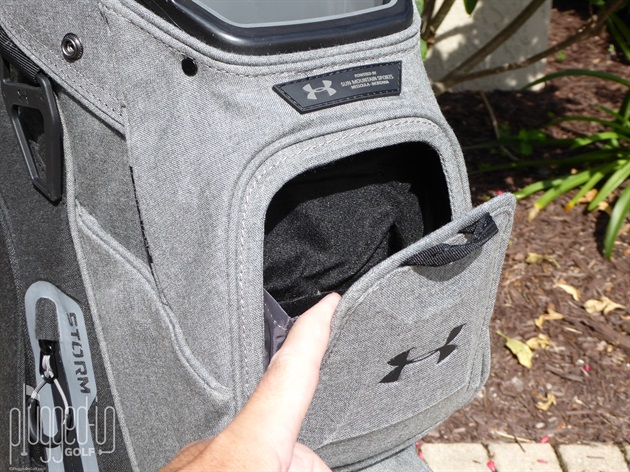 On the front, just below the putter slot, is a magnetic flap pocket that offers a lot of options. With its velour lining, I found it perfect for quick access to my range finder, while the mesh pocket on the flap itself was nice for some loose bills. It takes some effort to pull the flap open and the magnets around all three sides really snap the pocket closed.
