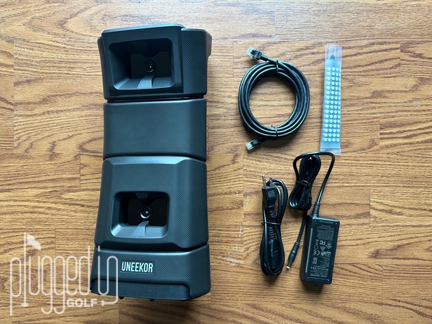 When you unpack the Uneeker EYE MINI, you’ll find the launch monitor, charger, ethernet cable, and the stickers for club measurement. What’s disappointing is that you will not find an instruction manual or even a quick start guide. All the manuals are found on Uneekor’s website.