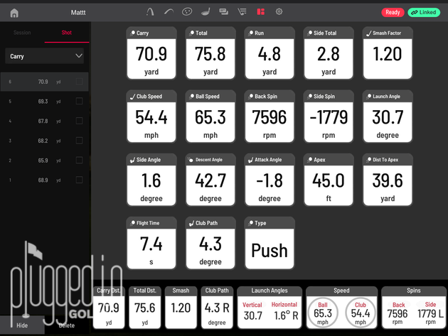 From the wedges through the mid irons, the two devices were in near-perfect agreement. Ball speeds, launch angles, club measurements, and distances were all plus or minus one, and the spin numbers were within 300 RPM. As I got into the long irons and woods, the gaps became slightly larger. Ball speed discrepancies were as large as 2 MPH and carry distances could be as much as 4 yards apart. Launch and spin numbers were still quite close, which makes me think part of the distance gap can be attributed to a different distance calculation.