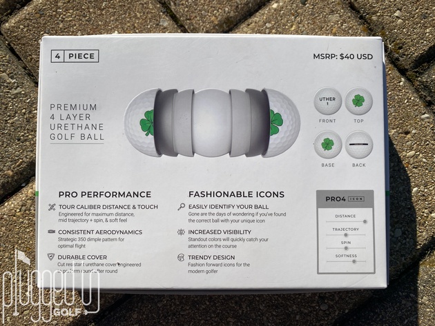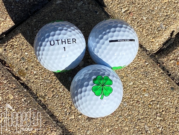 The Pro Icon golf ball has the widest range of styles. I like the “Icy” icons that I tested – they’re unique but the black and white designs keep them from screaming, “Look at me!” If you want something bolder, Uther has bombs, waffles, and a “Golf Love” icon which is pretty great. The Pro4 offers the clovers you see here and a Birdie set with four types of winged friends. Uther also makes a Pro Soft model that has donut and flamingo icons.