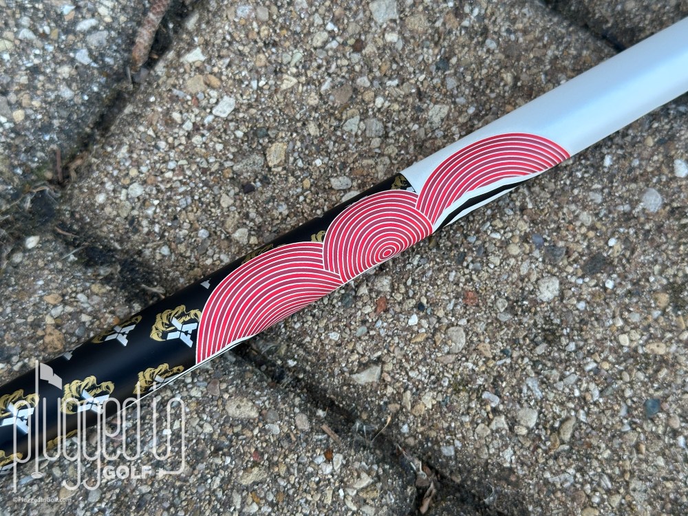 Starting under the grip, the shaft is black with white VA logos inside of golden claws.  The transition to white is done with a tear on the “logo up” side and a series of red concentric circles.  Gold “Raijin” branding and a final VA logo bring the graphics to a close, leaving the entire lower portion solid white.