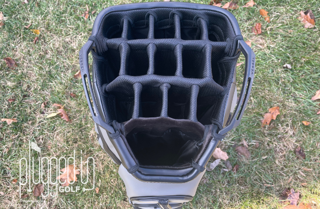 The top of the bag features 15 full length dividers. Why would anyone need 15 dividers? For me, I carry an Orange Whip but others may want an extra divider for alignment sticks or a support rod for protecting clubs while traveling.