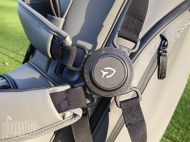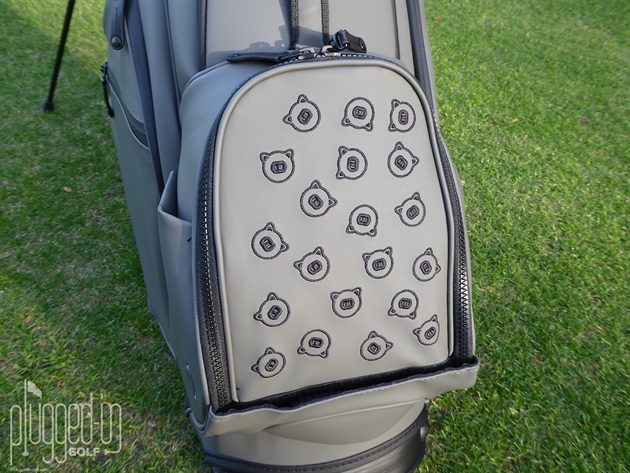 Instantly, I noted the rich solid matte grey color of the Player III that gives it an upscale look. Trimmed in black, the bag looks elegant yet durable. The insulated magnetic water bottle sleeves hug the ball pocket when not in use to maintain a sleek look. Even the design of the black, compression molded back pad looks stylish. And of course, nothing gives a golf bag elevated eye appeal like personalization, and the folks at Vessel designed and executed the dancing PIG icon panel to perfection.