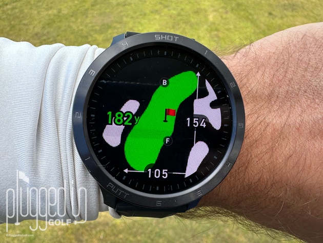One of the elevated features of the T11 Pro is the multitude of displays. From the tee, you get an overview of the entire hole, including a “flyover.” From this view, you can tap anywhere on the hole to get a yardage to that point. Tapping hazards shows you the distance to the hazard and the distance to carry it. Once you get within about 190 yards, the display switches to a view of the green (above) where you can tap to place the pin.