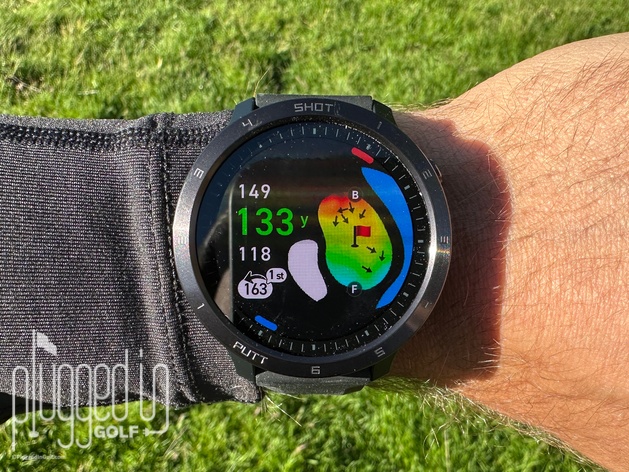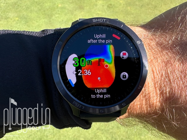On the green, if the course’s greens have been mapped, you get an elevation map of the green with the ability to tap your ball’s location and get a read on the putt.