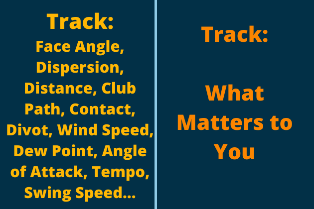 For any given golf swing, you could track a multitude of different things, particularly if you have a launch monitor. Off the top of my head, I would list swing feel/thought, ground contact, face contact, swing path, club face, ball flight, distance, dispersion, and trajectory.
