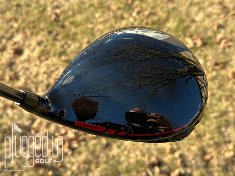The Wilson DYNAPWR Max driver has a unique look address compared to the other two DYNAPWR drivers.  There is no carbon fiber here, just a clean, uninterrupted, gloss black crown.  It does share the light red heel graphics and small, square alignment aid with the Carbon driver and LS driver [review HERE].