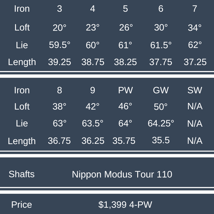 The Wilson Staff Model XB irons are beautiful clubs with a level of forgiveness that belies their size. Solid distance and ball speed without sacrificing control and playability. Solid, traditional feel.