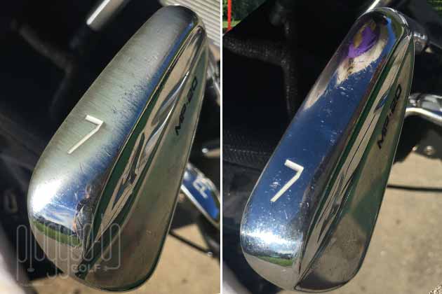 I have used cheaper quality mats and noticed a plastic film will accumulate on the bottom of the club from impact (image on left). The quality materials of the Quattro do not produce any plastic film or scuffing (image on right).