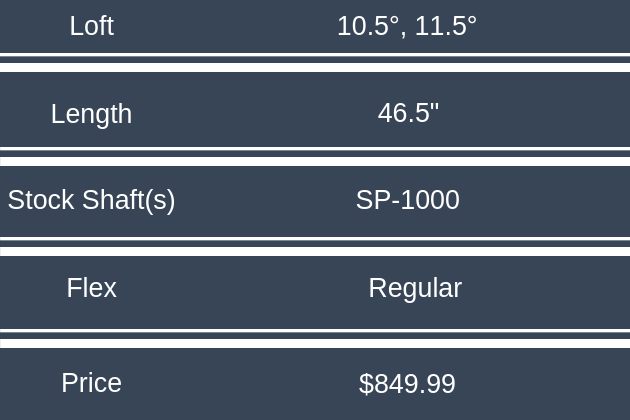 The face of the driver is forged Super-Tix PLUS Titanium that actually turns into the crown despite what your eyes see. That cup face design adds distance while a sweet spot more than double the previous generation makes it more consistent. Also adding to the distance equation with increased club head speed is the new extremely lightweight, 39 gram, SP-1000 shaft.